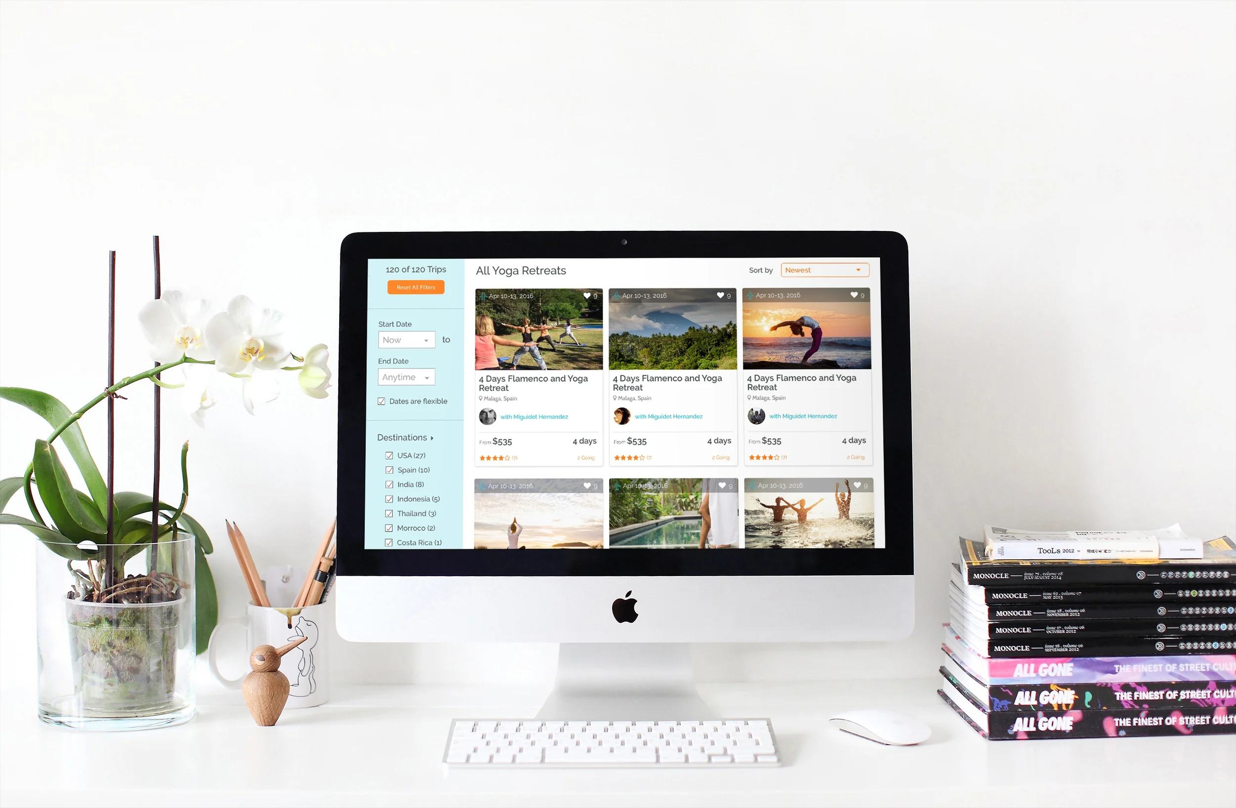 After a feedback loop, I created hi-fi mockups for the yoga page and trip listings page in Sketch, and then turned them into an interactive prototype using Invision.