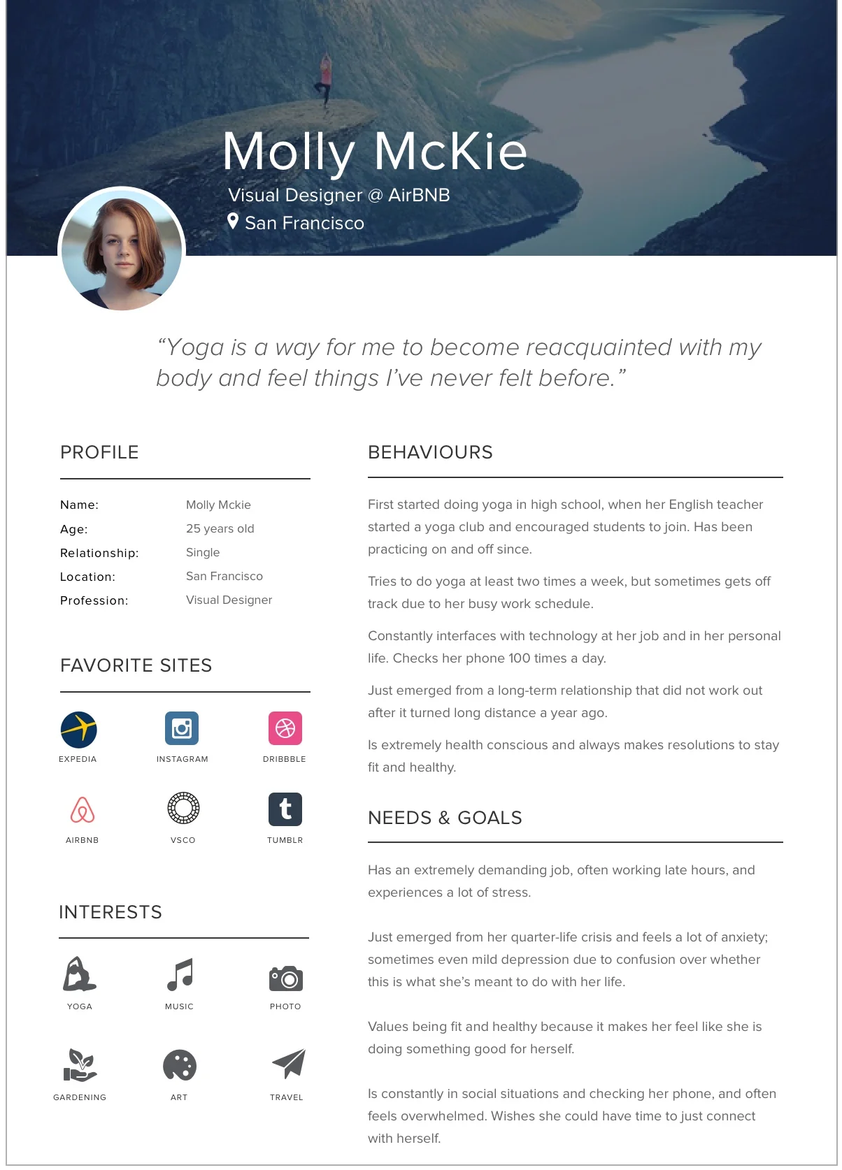 After gathering and synthesizing main user insights from the research phase, I created a persona of the typical WeTravel Yoga user who I could always refer back to.